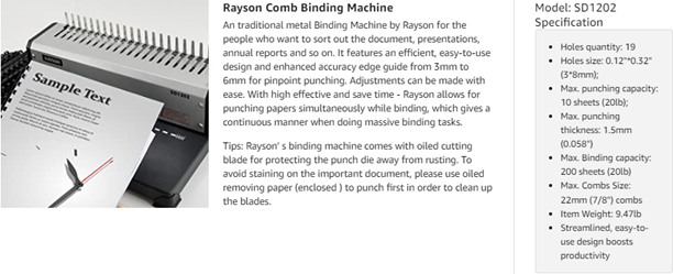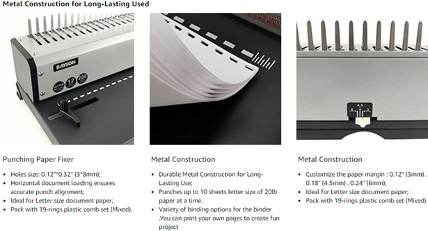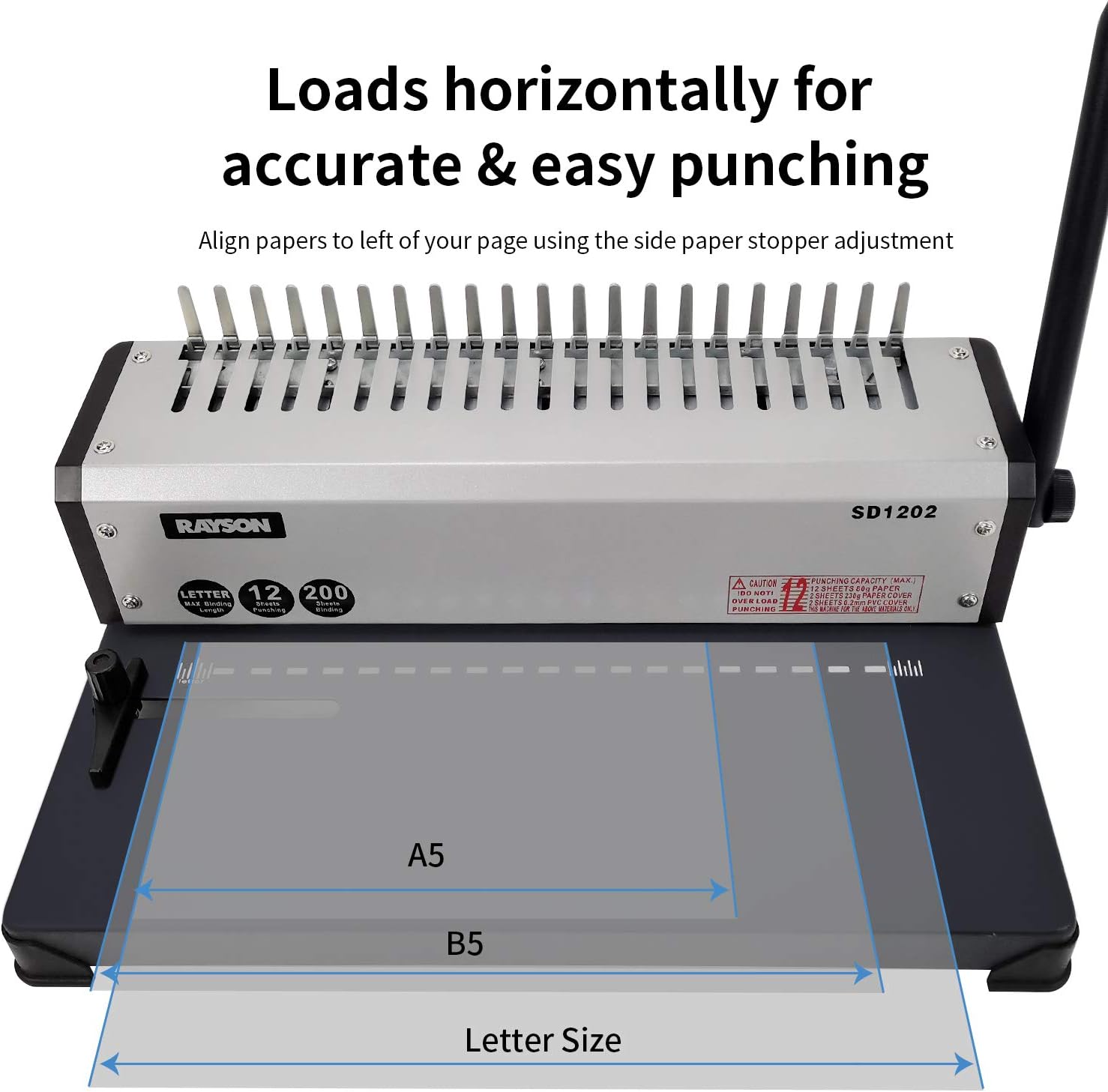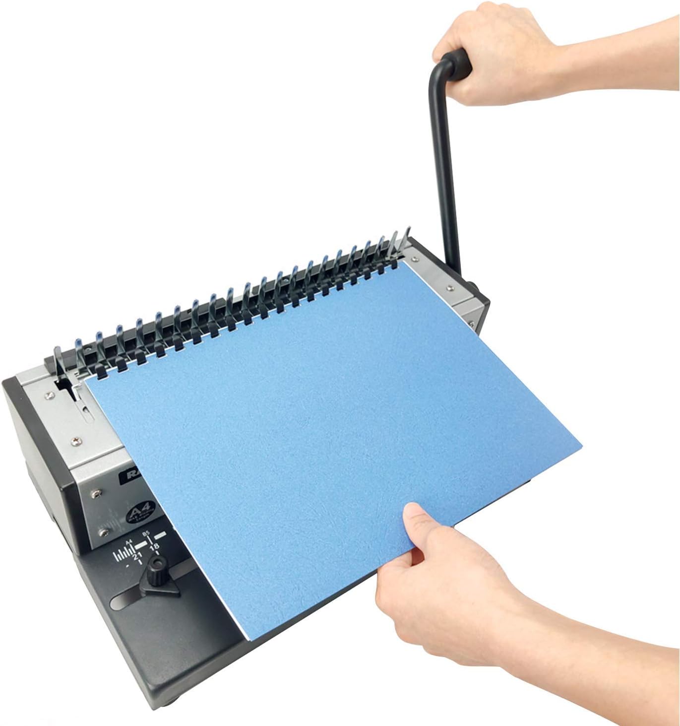 Manually punch up to 10 sheets of 20lb (80g) paper at a time. And binds up to 200 sheets (letter size) of 80 gsm (20lb) paper with a 22mm (7/8") comb ring.
