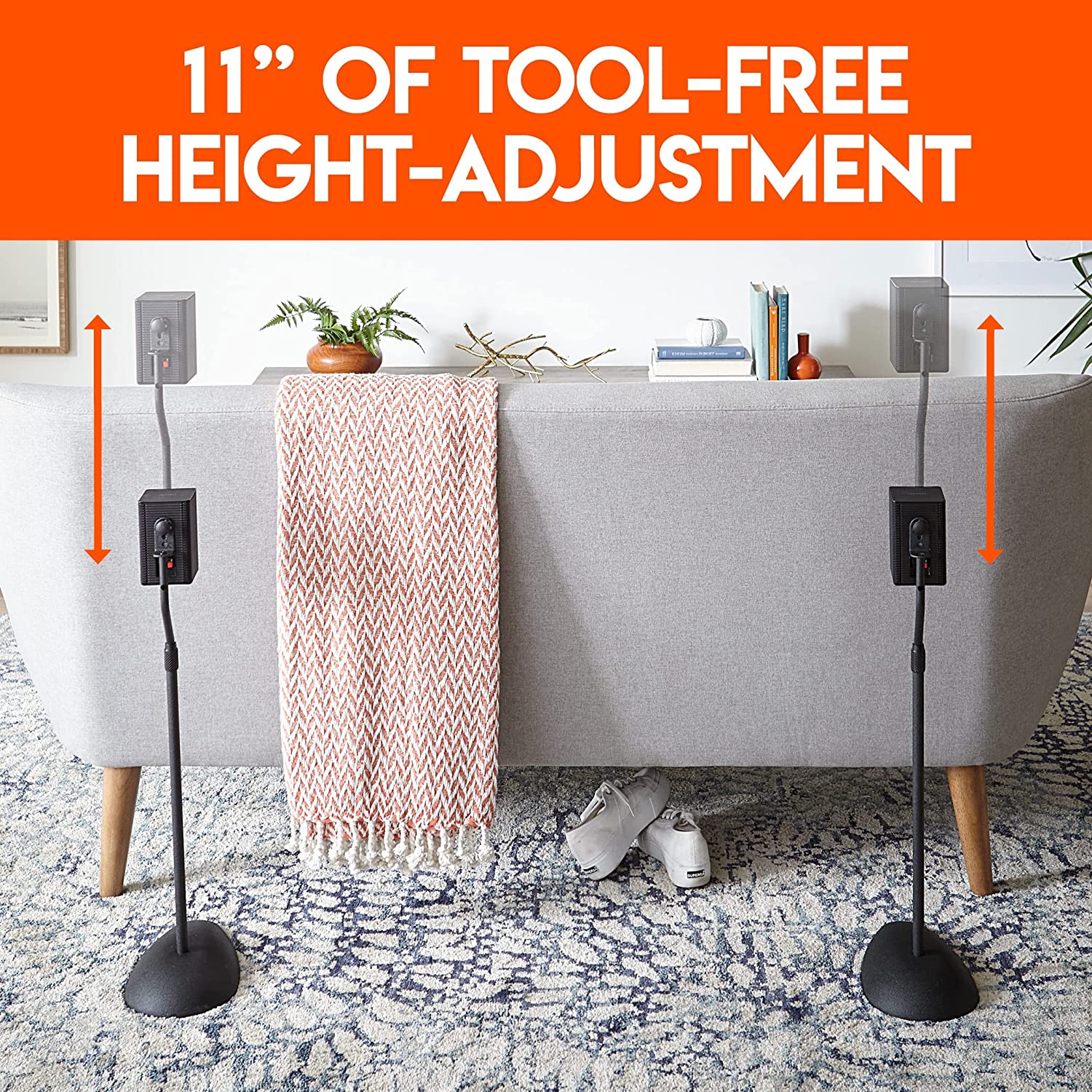 • Adjust speaker height up to 11" with no tools required. Just turn the collar to change height on-demand. Now your speakers will always be at the perfect height.