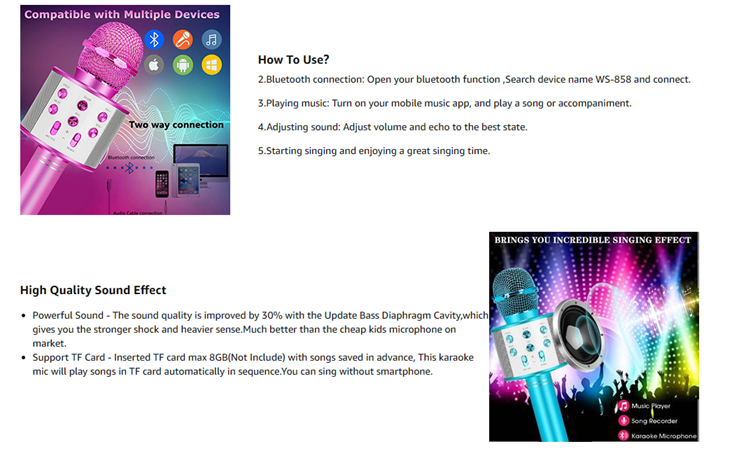 • ♪【Two Ways Connection & Long Time Use】- You just need to connect your phone with cable or bluetooth. The bluetooth microphone wireless high-capacity battery provide over 8 hours continuous use to keep your birthday party going all night.