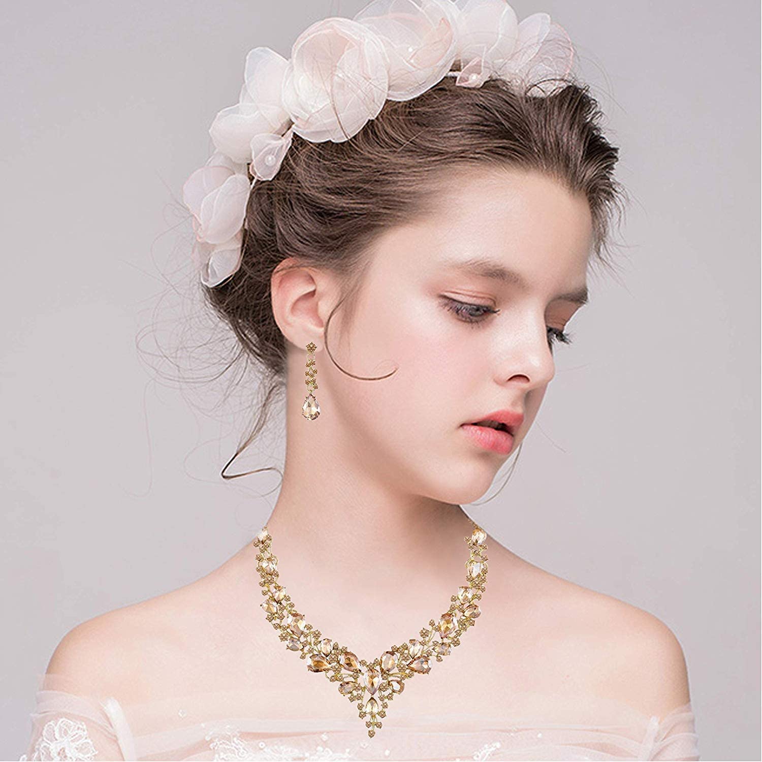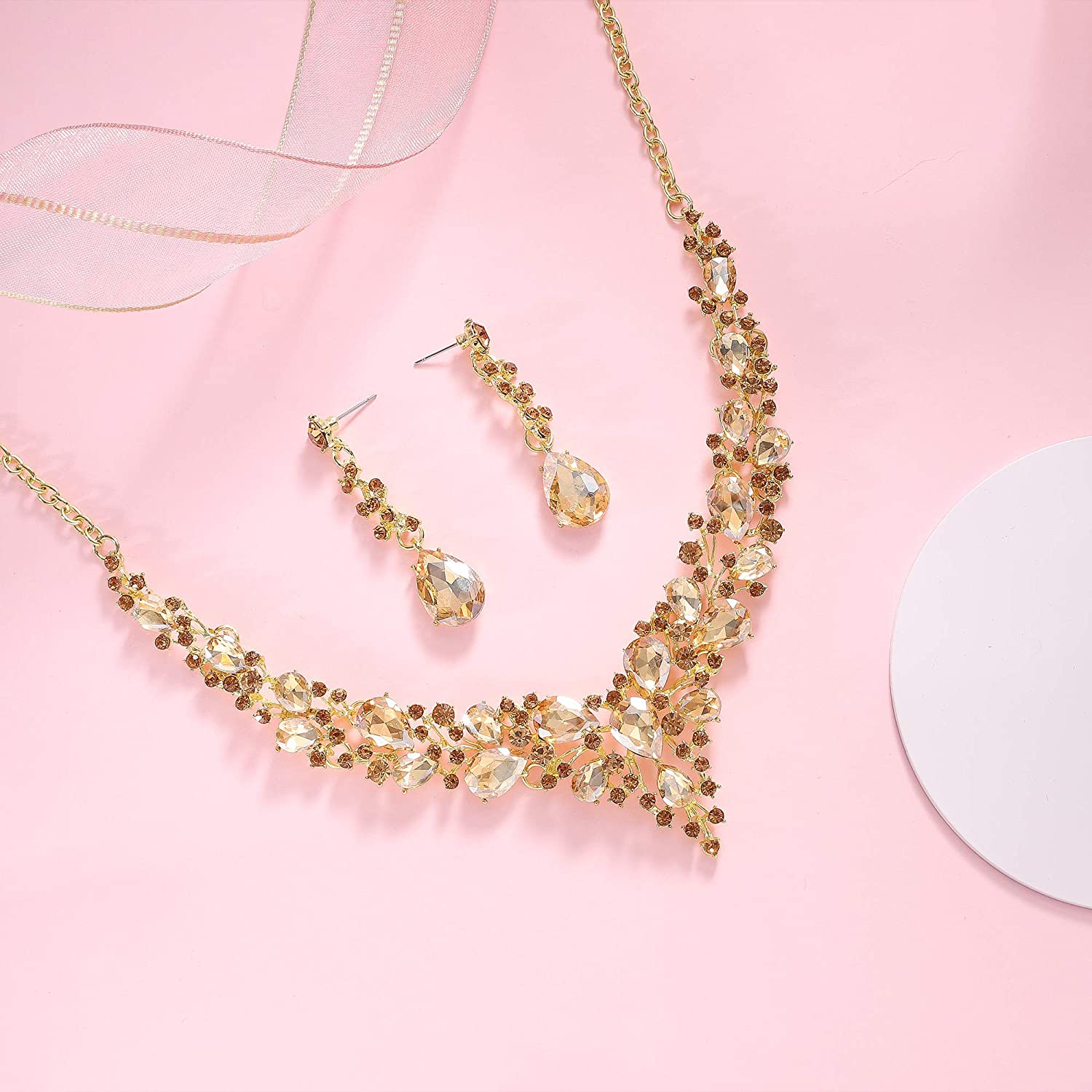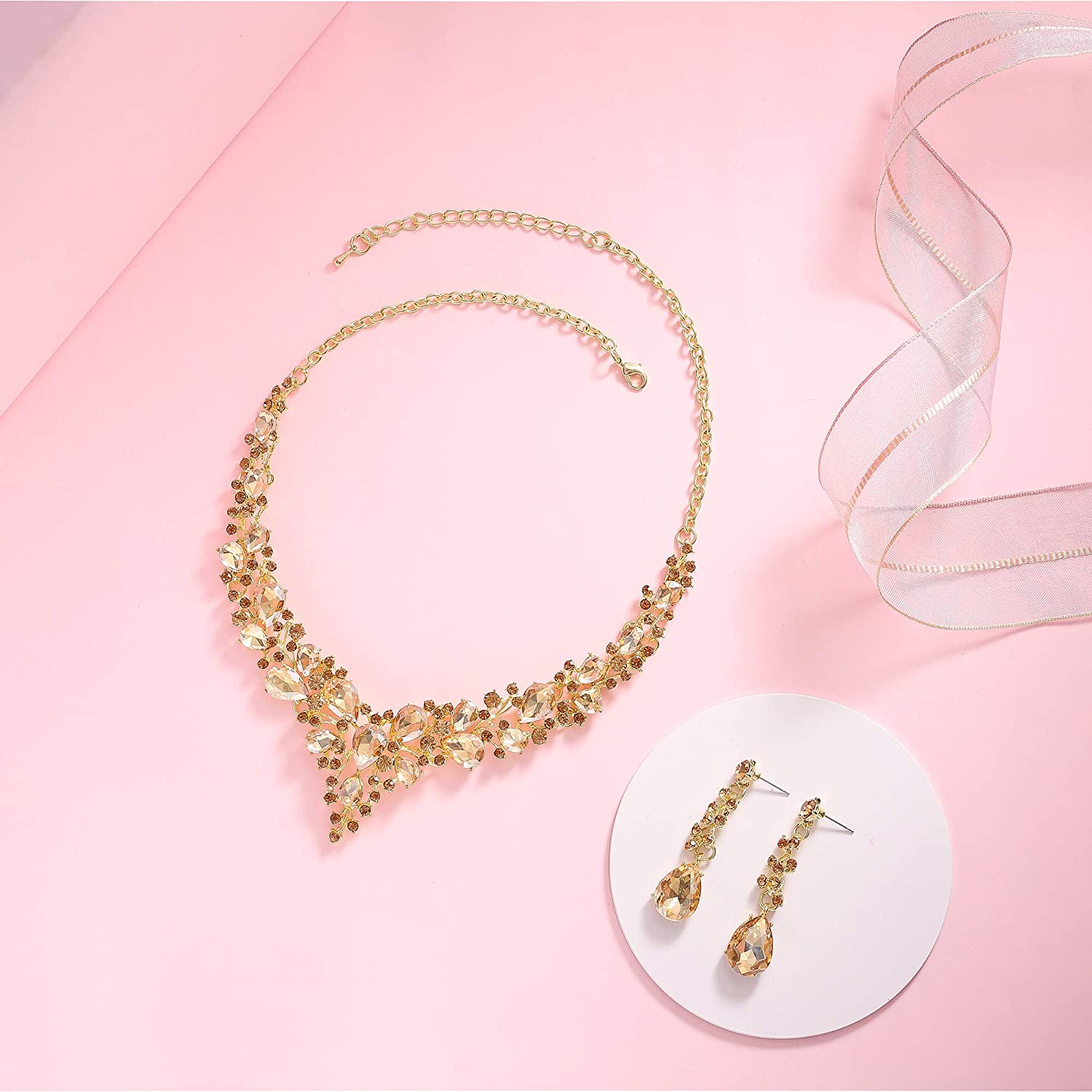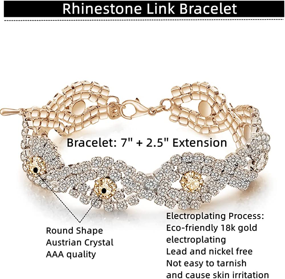 • ♥ Specification ♥: Brand Name: Paxuan. Material: Gold Plated Copper Base Chain + AAA Quality Austrian Crystal. Size: Necklace: 17'' + 2.5'' Extension. Earrings: 1.8'' in length. Bracelet: 7'' + 2.5'' Extension. Quantity: Necklace + Earrings + Bracelet. Color: Gold plated champagne crystal(Great for wedding or prom dress).