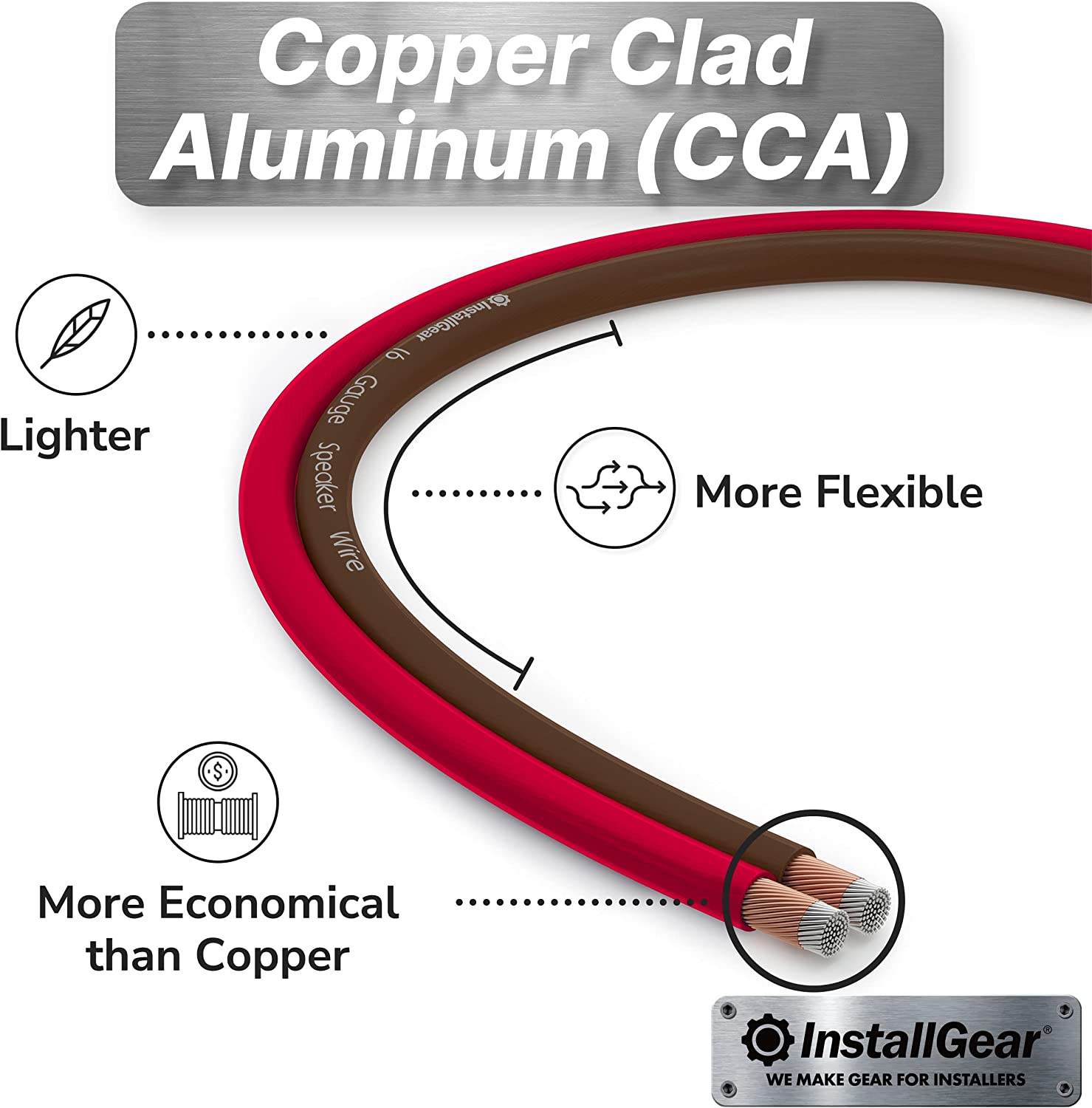 COPPER CLAD ALUMINUM (CCA) - CCA wiring provides a good conductor for transmitting audio. This is the most economical option when choosing speaker wire.