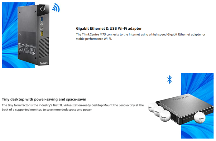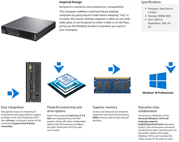 • Lenovo ThinkCentre M73 Tiny Business Desktop Computer, Intel Core i3 4130T 2.9GHz, 4G DDR3, 500G, WIFI, USB 3.0, VGA, DisplayPort.