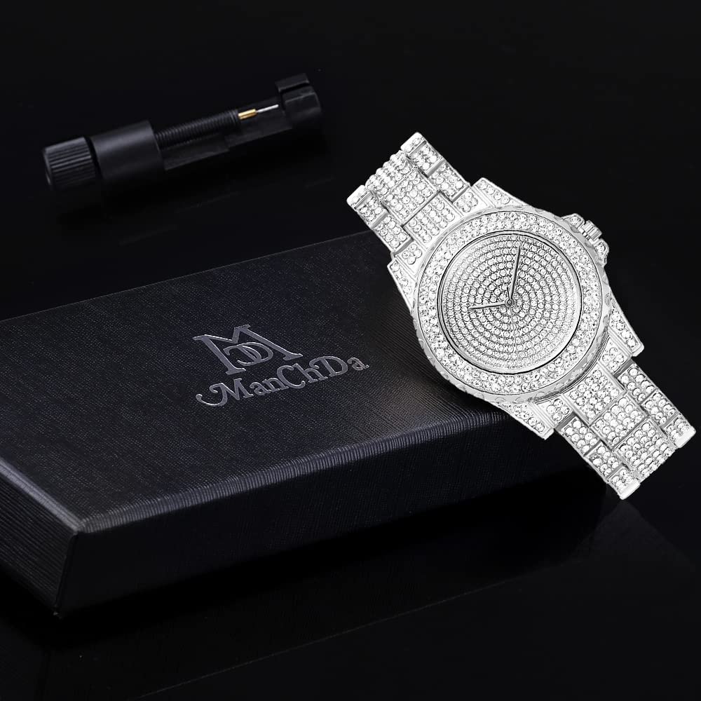 ManChDa Ladies Iced Out Watch Quartz Movement Women Stainless Steel Crystal Rhinestone Diamond Wristwatch