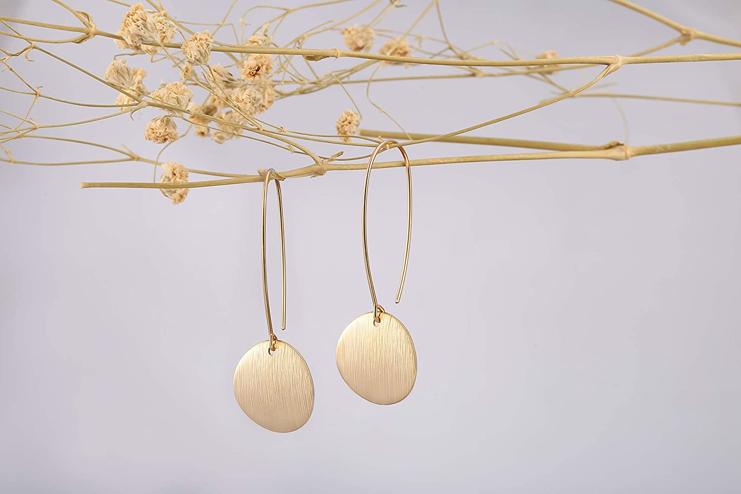 - Earring Design: Golden dangle earrings drop hoops with beautiful dainty and sparkling classic disc. A timeless design perfect for any age making circle drop earrings a great gift choice. You can choose disc drop earrings as ideal gift for birthday, Thanksgiving Day, Valentine’s Day, anniversary, graduation, Mother's Day, Christmas, etc. The minimalist earrings are especially suitable everyday jewelry for women and girls.