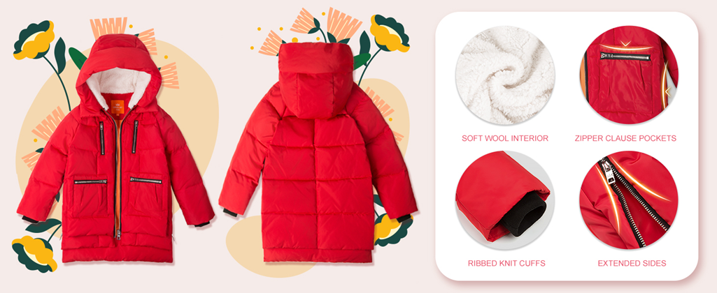 • Featuring warm fleece lined hood, special side zippers, big zipper pockets, it is warm and cute for children to enjoy the outdoor activity in wintry days.