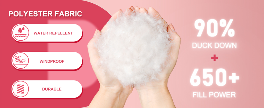 • Shell/Lining Fabric: 100% polyester; Body/Sleeve Filler: 90% white duck down, 10% duckfeather.