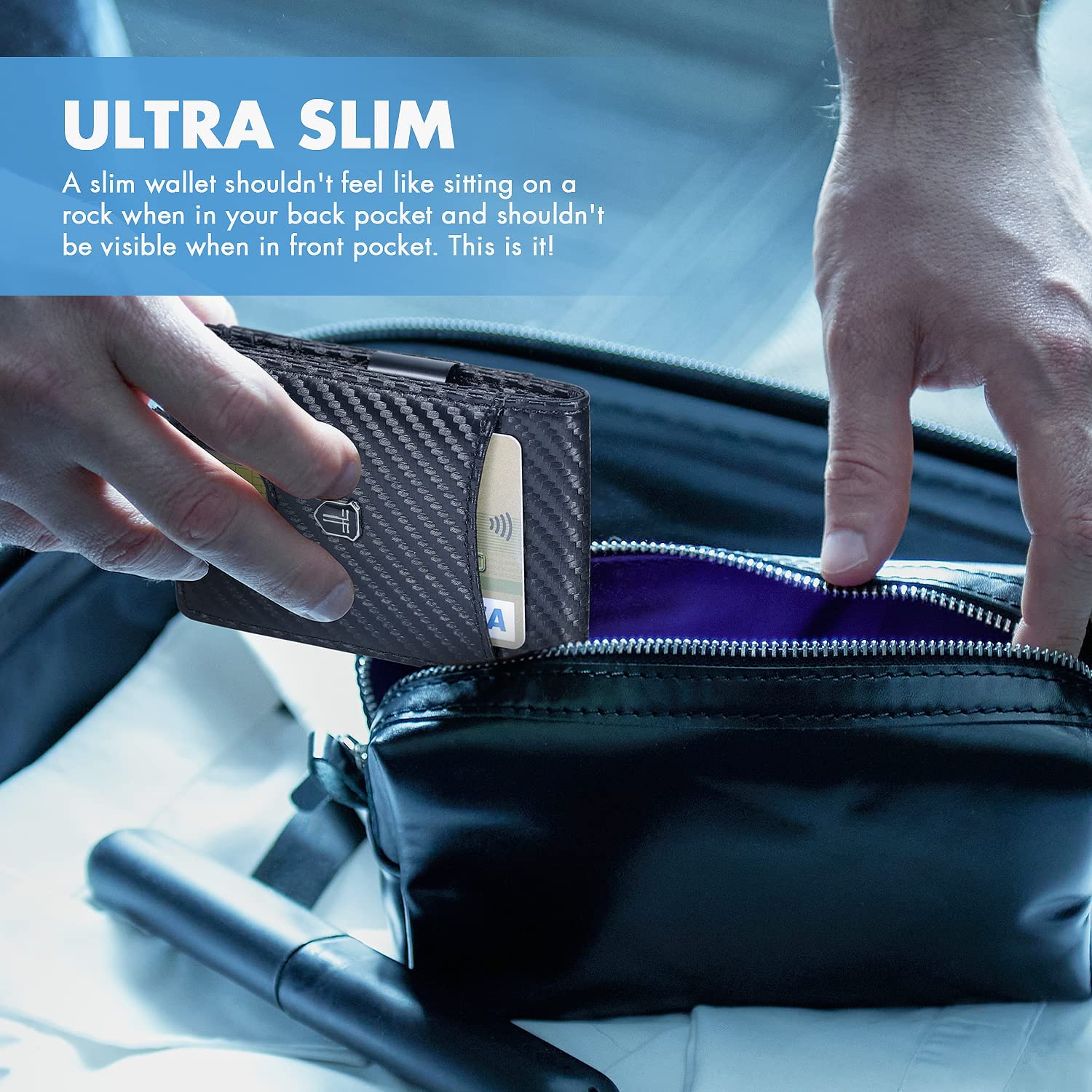 • ULTRA SLIM & MULTIFUNCTIONAL - Best slim wallet that measures only 3.9"x2.76"x0.34". A men’s wallet with enough room for essential cards and cash without being bulky. Front pocket for the most used cards for quick access. Outside pocket for ID cards so you don’t have to open the whole wallet