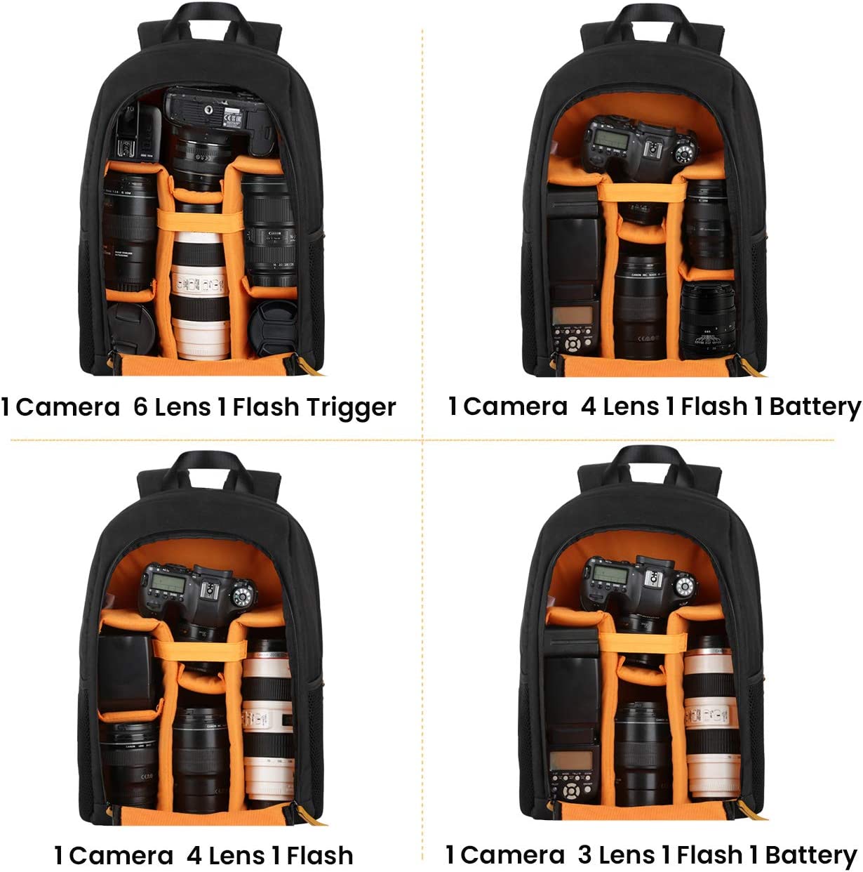 - 【Large Capacity】 This professional camera bag can hold 1 camera 6 lens 1 flash trigger. Inside there is a zippered mesh pocket for accessories, iPad and other tablets etc. High-elasticity mesh sides pockets can used for bottle and umbrella etc.