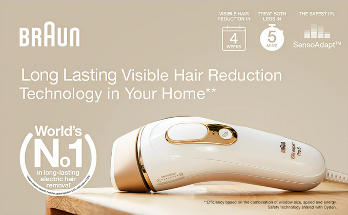 Silk·expert Pro is Braun’s latest generation IPL. Silk·expert Pro 5 is the safest, fastest and most efficient IPL* for long-lasting hair reduction in just 4 weeks*. The safest IPL technology, clinically tested and dermatologically accredited as skin safe by an international skin health organization (Skin Health Alliance). It automatically and continuously adapts to your skin tone to ensure optimal balance between efficacy and safety† for visible long-lasting hair removal. The fastest IPL, it’s 2 times faster than previous Silk·expert 5: both lower legs can be treated in less than 5 minutes. It includes a precision head to tackle the smaller areas such as the face, bikini line or underarms. New compact design, 15% smaller and 25% lighter, for easy handling and effortless treatment. 400,000 flashes, 30% more than previous Silk·expert 5. Assessed on lower leg, armpits & bikini, following the treatment schedule. Individual results may vary. †Shared technology with Cyden. For more information, visit Braun.com website