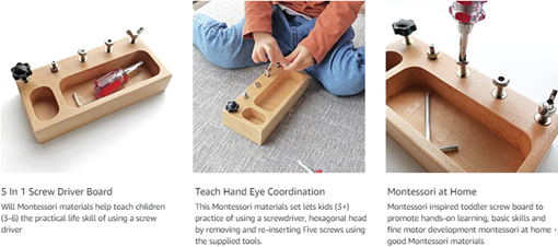 - This Montessori Materials Toys Set Lets Kids (3+) Practice of Using A Screwdriver, Hexagonal Head By Removing and Re-inserting Five Screws Using The Supplied Tools.