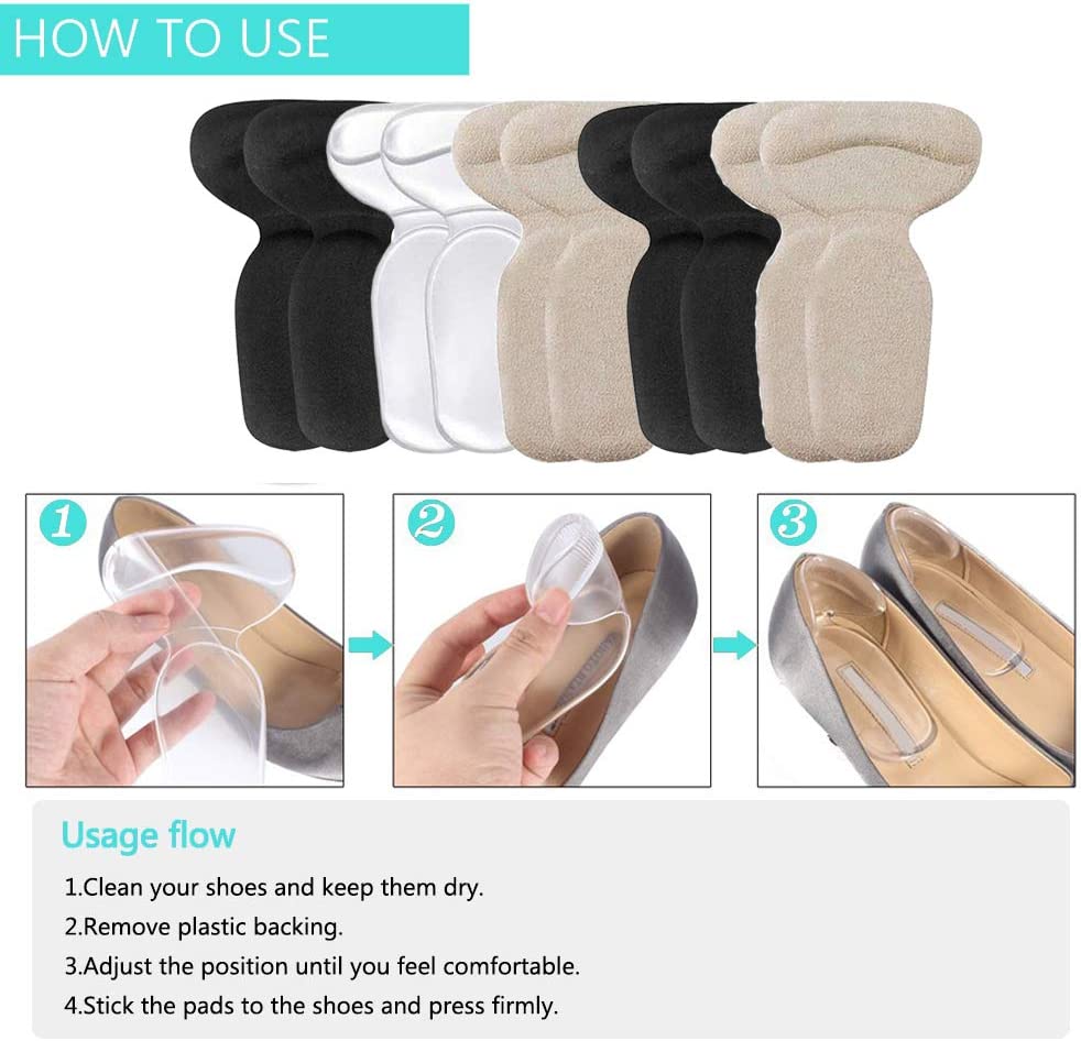 LOOSE SHOES:We recommend that you use them in loose shoes to avoid pinching your feet.The heel grips are designed to fit the outline of the heel part of the shoe.Reduces about 1/4 to 1/2 ish of sizes. These heel cushion inserts make shoes a bit more tight. Gel material stop your feet from slipping in and out of your shoes.