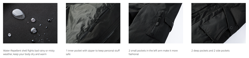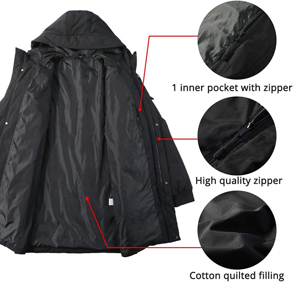 DESIGN 1: Water-Repellent shell fights bad rainy or misty weather, keep your body dry and warm; down cotton quilted filling provides perfect warmth and comfort in cold fall and winter; total 7 pockets, 2 deep pockets and 1 inner pocket with zipper to keep personal stuff safe, 2 side pockets to keep hands warm, 2 small pockets in the left arm make it more fashional; hooded design with Drawstring prevents cold air