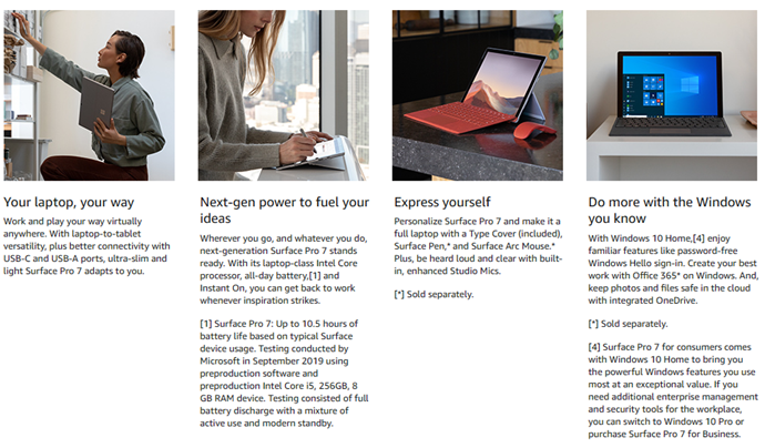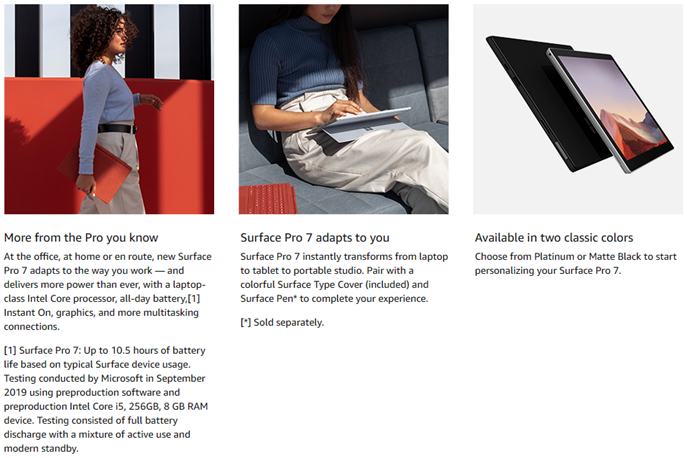 At the office, at home or en route, New Surface Pro 7 adapts to the way you work with laptop-to-tablet versatility. And now, it delivers more power than ever, with a laptop-class Intel Core processor, all-day battery, Instant On, improved graphics, and standby time — plus more multitasking connections, including both USB-C and USB-A ports.