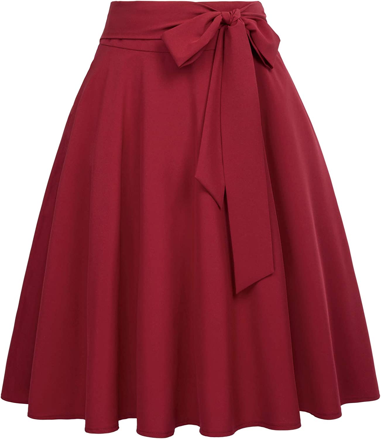 Skirt Feature: High waist skirts; Open side-seam pockets; Fixed belt adorns waist; Flared A-Line silhouette; Concealed zipper in the back