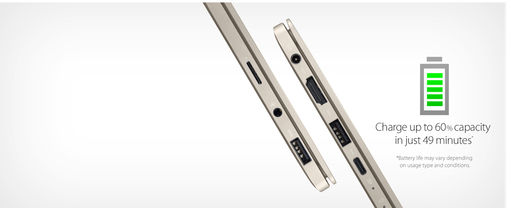 • A specially designed 50Wh lithium-polymer battery gives UX331 up to 14 hours of autonomy, with fast-charge technology that takes just 49 minutes to recharge to 60% capacity