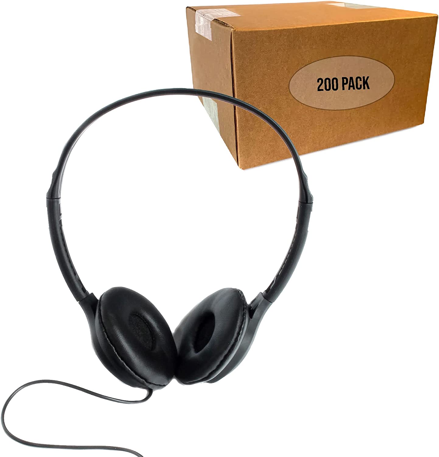 It contains 25 low-cost stereo school headphones, individually packaged in a heat-sealed plastic bag