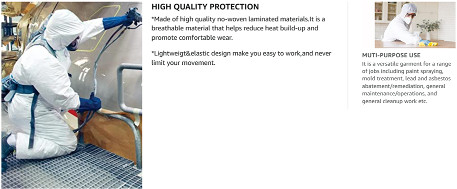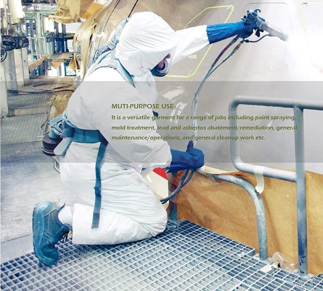 ▷MUTI-PURPOSE USE-It is a versatile garment for a range of jobs including paint spraying, fumigation work,mold treatment, lead and asbestos abatement/remediation, general maintenance/operations, and general cleanup work etc.Not for chemical resistant.