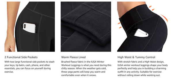 • ★Practical Side Pockets: To offer you great convenience, IUGA fleece lined leggings are featured with two functional side pockets to storage your phone,cards,and other essentials. Whether you are doing sports outdoor or simply lounging at home, yoga leggings will be your wisest option for a hands-free and low-maintenance workout.