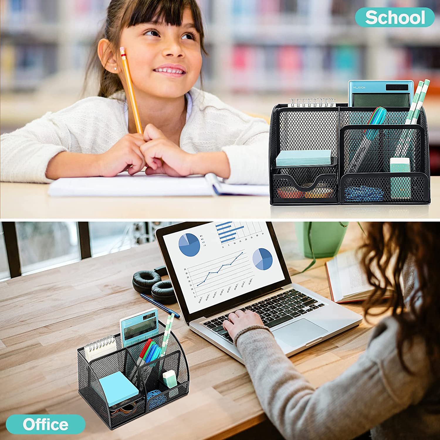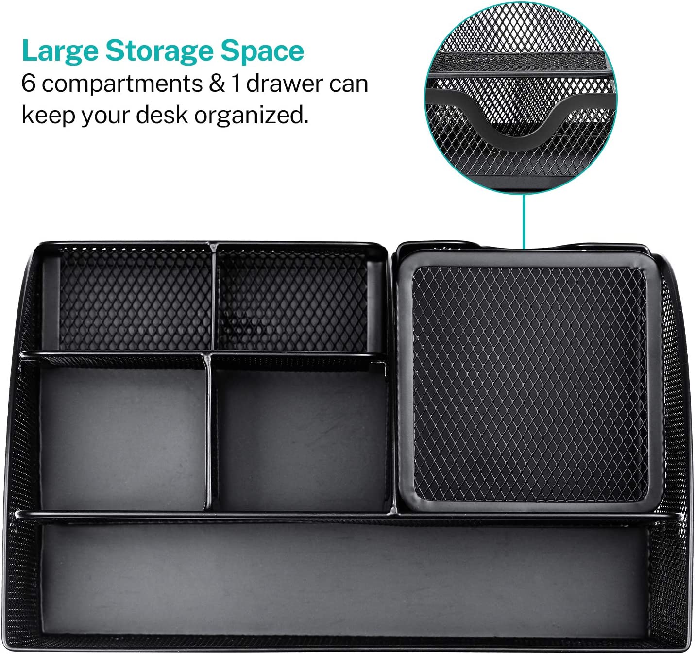 MaxGear Mesh Desk Organizer Office Desktop Organizer with Drawer, Metal Stationary Organizer Black Desk Caddy, 6 Compartments, 8.7 x 5.5 x 5 inch, 1 Pack