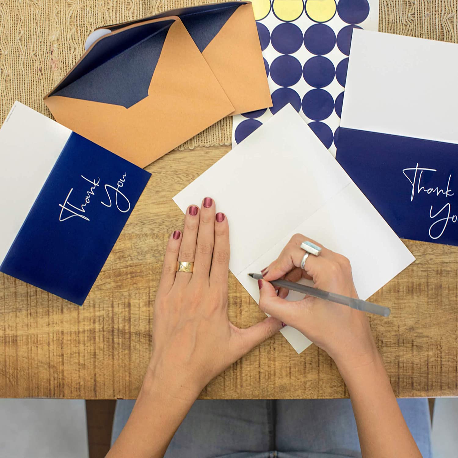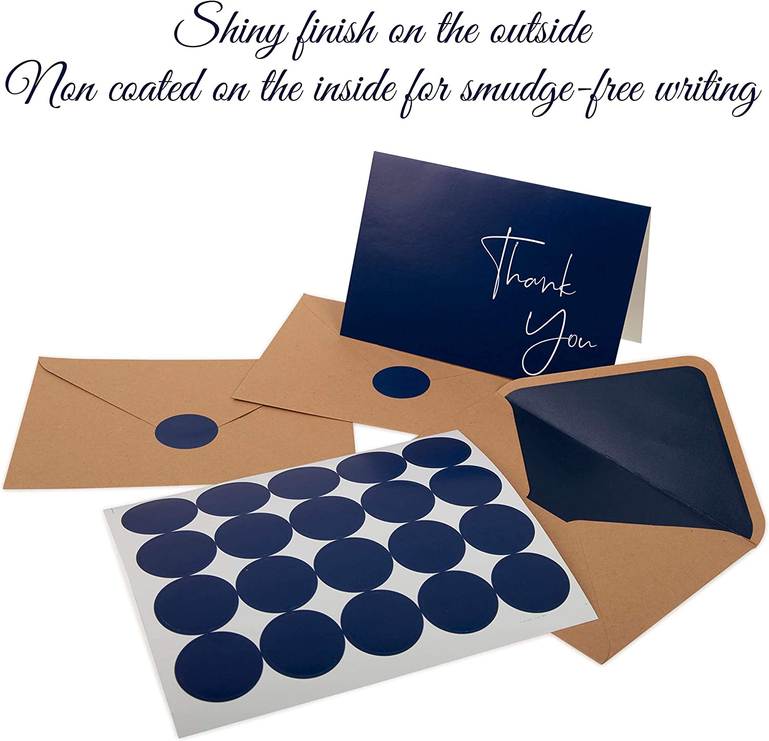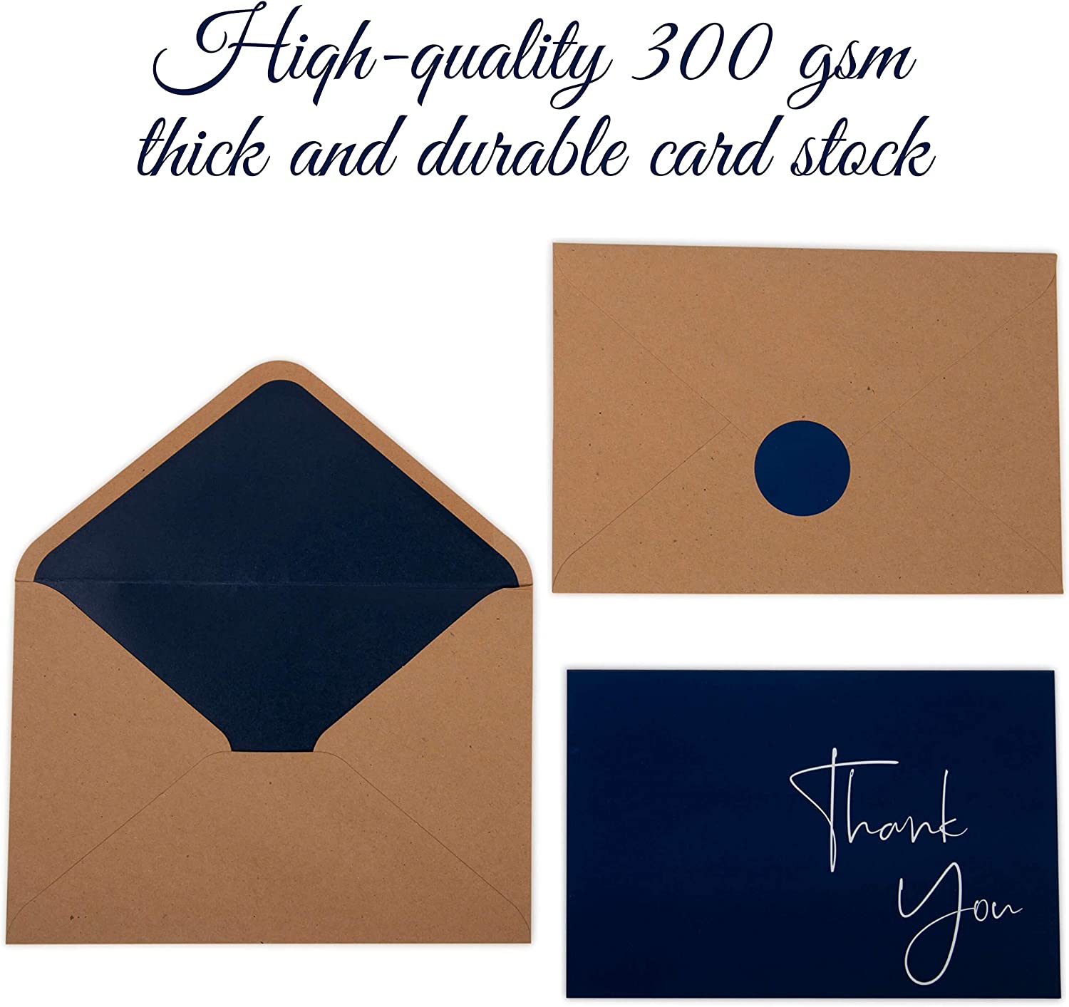 • ✔️ CLASSY DESIGN FOR ANY OCCASION: Each box set of 100 thank you cards come with matching lick-to-seal sturdy kraft envelopes with a blue interior lining as well as a matching themed sticker to seal the envelope and tie it all together. Be sure to always have a pack of greeting cards on hand, whether you need to thank a friend, send a special note, or make some staff appreciation cards!