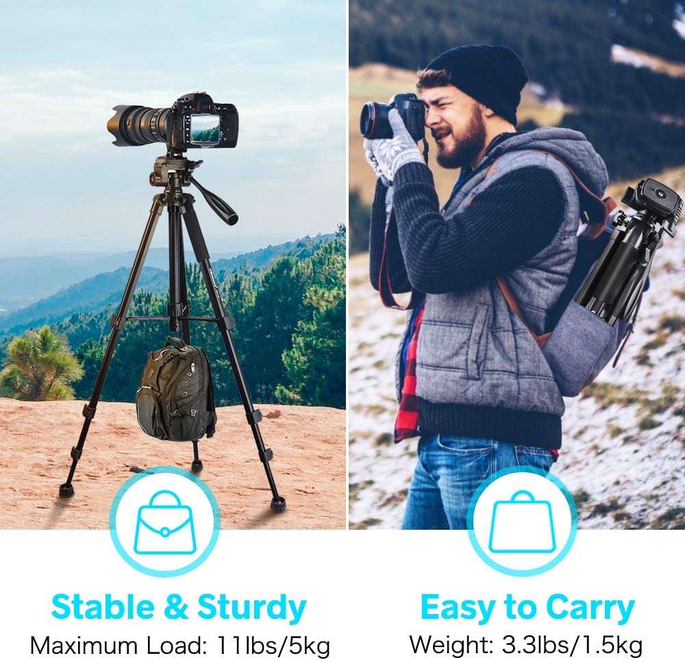 - 【Wide Compatibility】This camera tripod has a sturdy phone holder and 1/4 Universal Screw. And it can extend from 20.87 to 74in, this tripod fully for All Cameras(Nikon D3500/D7500, Canon m50 EOS rebel t6 t7, Olympus, Panasonic).