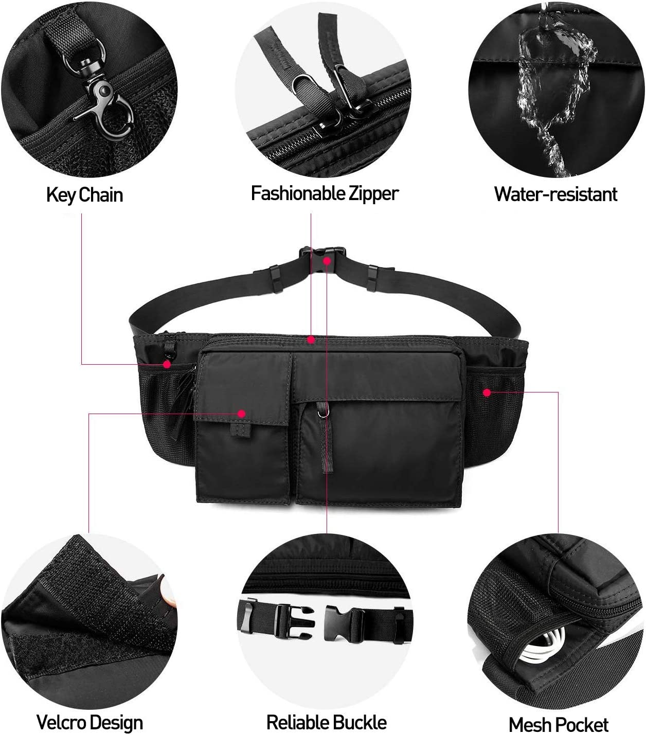 Premium Material - black fanny pack belt bag is made of nylon with excellent air permeability. wear-resistant, durable and waterproof material & linings, with exquisite overall craftsmanship, cleanly finished seams and made of strong 900D oxford waterproof material . wear-resistant fanny pack bag with durable material would be used for years notice: water resistant for drops or splashes, but do not take it into the water.