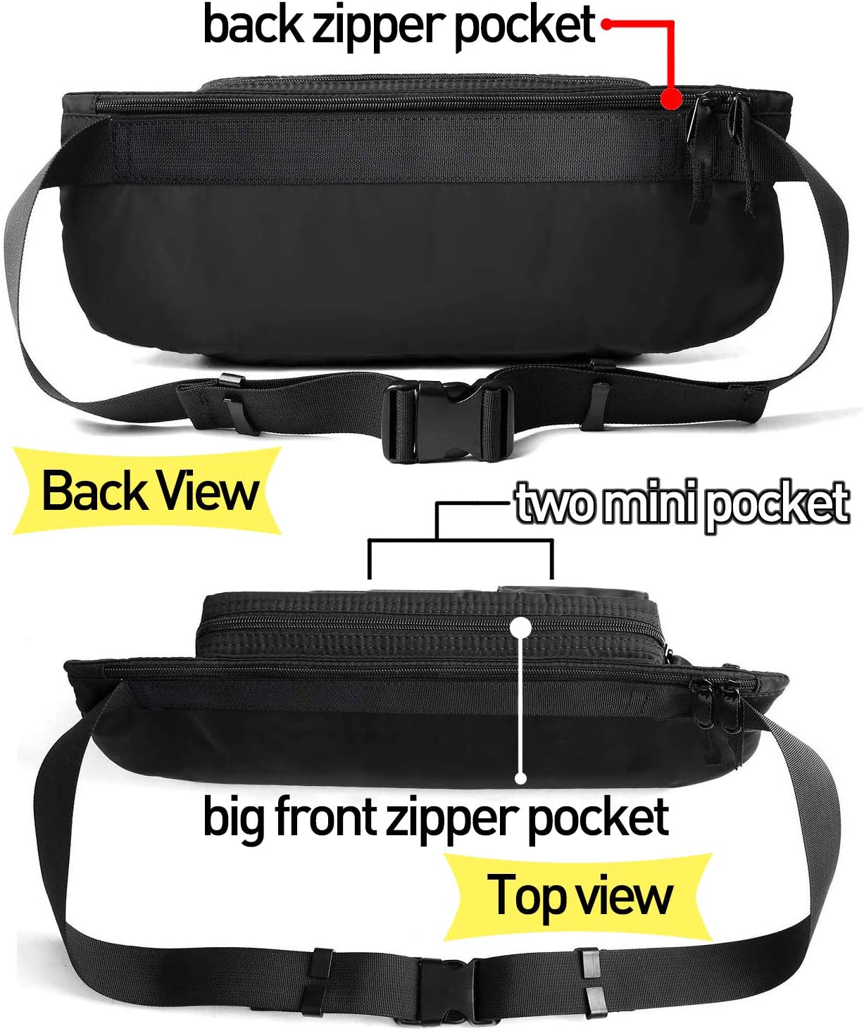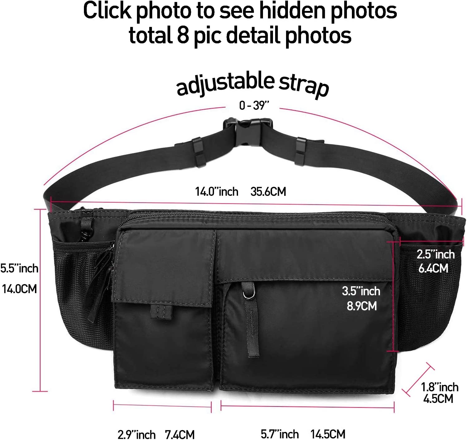 Multi-Pockets - the large black women & men fanny pack bag size is about 14"x 5.5" x 1.8 " inch (35.6cm* 14cm *4.5cm).(1)one big front zipper pocket with two-way zipper.(2)one back zipper pocket with two-way zipper.(3)two mini front pockets.(4)two mesh pockets(one mini pocket with zipper/ one mini pocket with velcro closed).the unisex fanny pack bag is great to store smart phone, wallet, money, credit cards, driver license and other valuables.