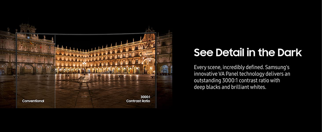 • SEE DETAIL IN THE DARK: Every scene, incredibly defined; Samsung's innovative VA Panel technology delivers an outstanding 3000:1 contrast ratio with deep blacks and brilliant whites