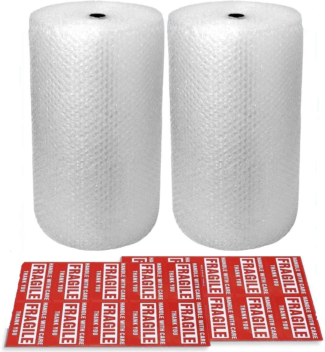 2-Pack Bubble Cushioning Wrap Rolls, 3/16" x 12" x 72' ft Total, Perforated Every 12", 20 Fragile Stickers for Packaging, Shipping, Mailing