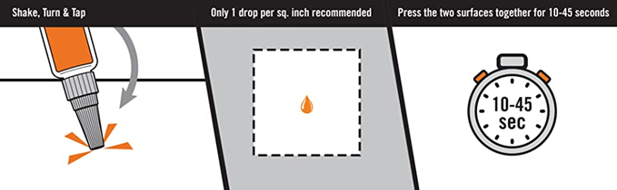 4) Apply Gorilla Super Glue Gel: Remove cap and apply a small amount of Gorilla Super Glue Gel to one surface. Only one dab per square inch recommended. Set time can vary based on the amount of glue and type of surface glued. Excess glue can cause delayed or failed bond.