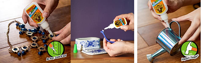 Gorilla Super Glue Gel is an easy-to-use, thicker and more controlled formula* great for multiple surfaces and vertical applications. Developed for long-lasting repairs in an instant, the clear glue dries in 10-45 seconds. This super glue gel is specially formulated to absorb drops and impacts. Super glue, also referred to as cyanoacrylate glue, or CA glue, works on a variety of materials, including plastic**, metal, stone, ceramic, paper, rubber and more. In addition to its high-performance formula, we've added an anti-clog cap with a metal pin inside to ensure an airtight seal for maximum reusability. It's Gorilla tough, every time.