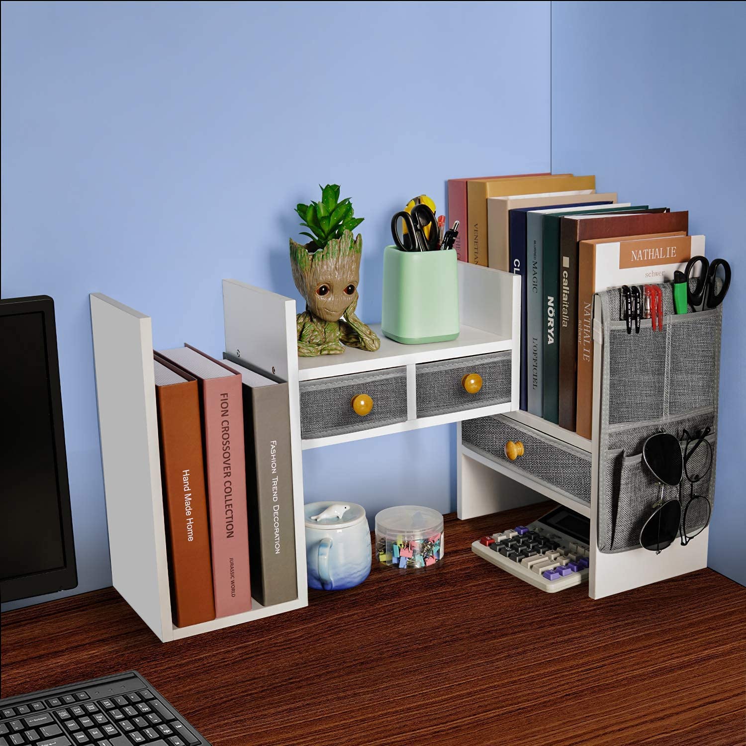X-cosrack Wood Expandable Desktop Bookshelf Counter Bookcase Adjustable with Drawers Desktop Shelves Rack Storage Organizer for Office Supplies,Makeup,White.Petent Pending