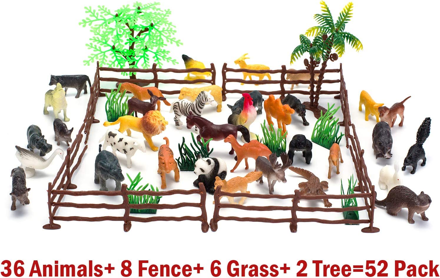 • GREAT VALUE PACKAGE: 52 Pieces assorted mini plastic safari animal figures, animal figurines measure about 2-3 inch, including 36 no repeats animals, 1 Trees, 1 Coconut tree, 6 Grass and 8 Fences.