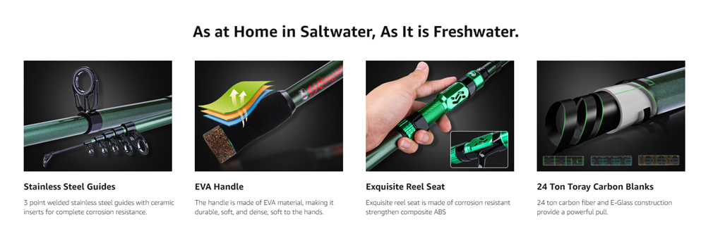 • The Exquisite Fishing Reel Seat Is Made of Corrosion Resistant CNC Machined Aluminum for a solid base and all-day; EVA handles are comfortable, durable and exceptionally slip resistant giving you maximum control over your fishing rod in all conditions.