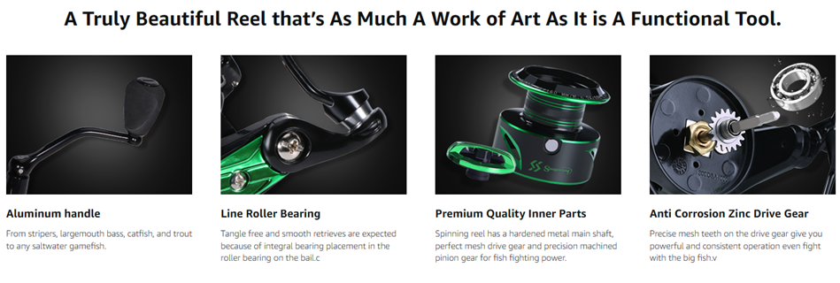• Spinning Fishing Reel With CNC Machine Cut Collapsible Handle, Left / Right Interchangeable, 12+1 Corrosion Resistant Smooth Ball Bearings.