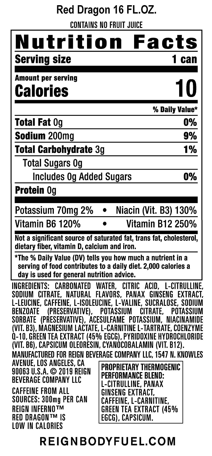 • THERMOGENIC PERFORMANCE BLEND: Reign Inferno’s proprietary thermogenic performance blend includes 300mg of Natural Caffeine, L-Citrulline, Panax Ginseng Extract, L-Carnitine and Green Tea Extract. Thermogenic ingredients increase metabolic energy levels to produce heat, which burns calories in combination with exercise and a healthy diet. Reign Inferno also contains the same attributes as Reign Total Body Fuel - Zero Sugar, BCAA’s, CoQ10, Electrolytes, B Vitamins (B3, B5 and B12), No artificial colors, flavors or fat.