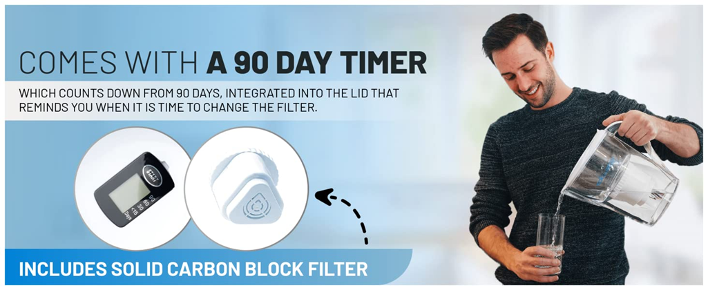 - The Pure Pitcher also comes with a LED timer, which counts down from 90 days, integrated into the lid that reminds you when it is time to change the filter. Never again will you have to guess about your filter. Got city tap water? Want to remove both lead and fluoride? Then, this is the pitcher for you...