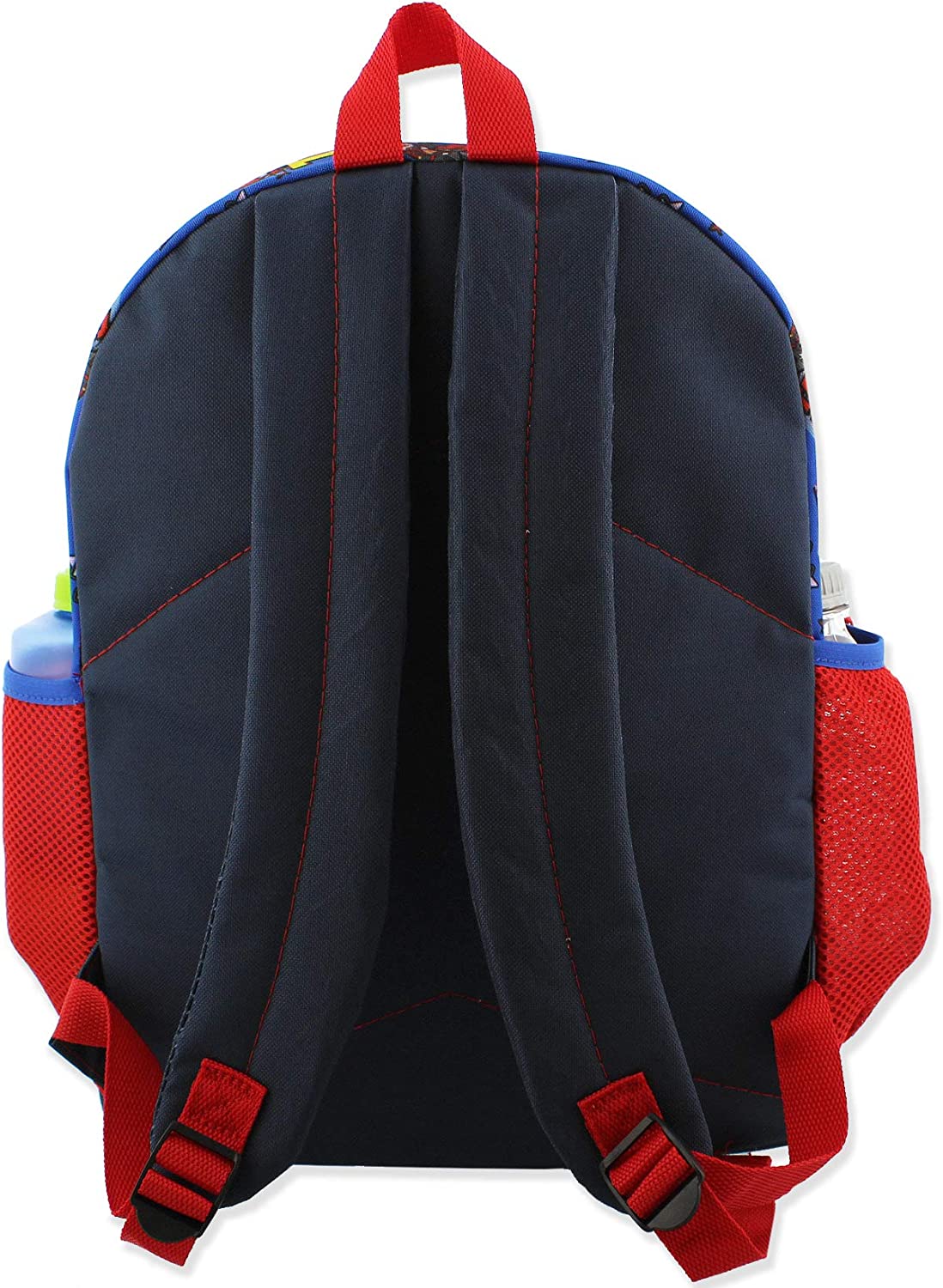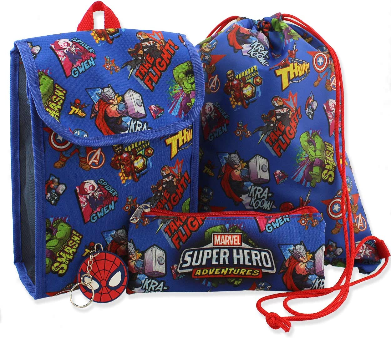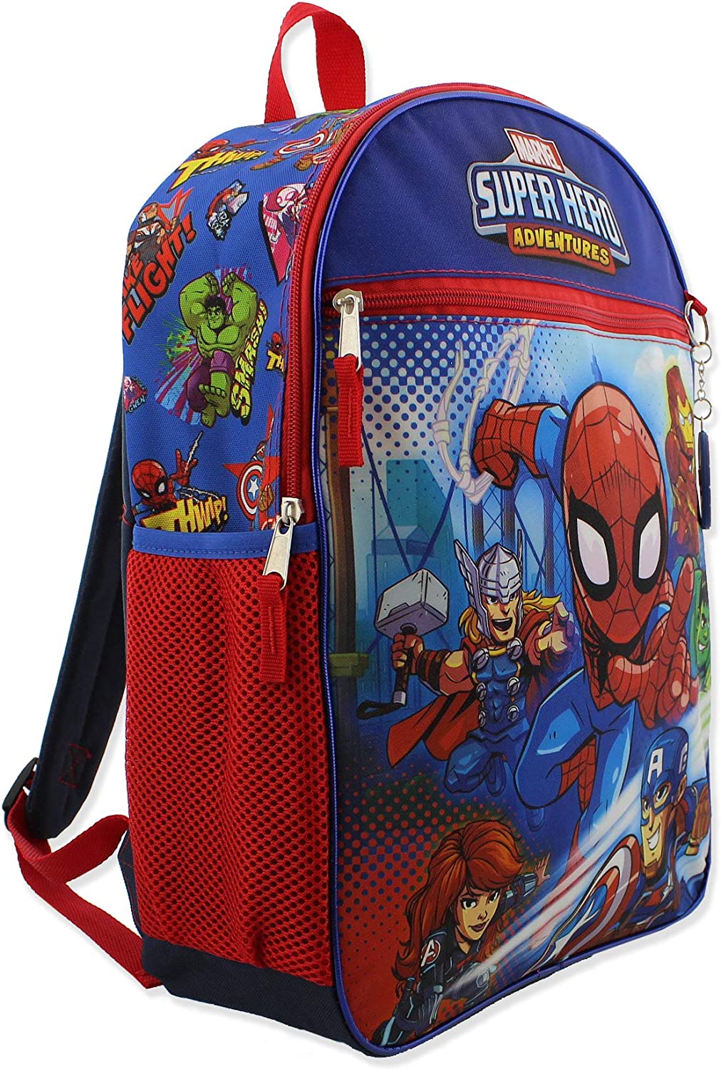 5-PIECE SUPER HERO ADVENTURES BOYS BACKPACK SET - This 5-piece Marvel Super Hero backpack and snack bag set is a great value. Included in this set is a stylish 16 inch backpack, a fold-able snack bag, a soft utility pencil case, a cool drawstring sack, and a Spider-Man Circle Logo Rubber Keychain. This matching set is the perfect back-to-school set at a very affordable price.?This backpack measures approximately 16" X 12" X 4". MULTIPLE COMPARTMENTS TO KEEP THINGS ORGANIZED - This Marvel Super Hero backpack school set helps your child keep organized throughout the day. The book bag contains a large main zip compartment, and a front zip compartment that easily stores pencils, and other supplies! Store a water bottle in the side pockets, snacks in the fold-able snack bag, and smaller items in utility pencil case.? WELL CONSTRUCTED AND COMFORTABLE - This quality book bag can be hung up when not in use by the? webbed locker loop. This school bag is designed in durable fabric with adjustable shoulder straps. The length of the shoulder straps is adjustable for the perfect fit. The side mesh pockets are made from athletic mesh for extra durability. FUN AND STYLISH - This book bag school set features your favorite Marvel Super Hero Adventures characters: Spider-Man, Thor, Ironman, Hulk, Black Widow and Captain America! It's the perfect travel, school, or camp set for any Marvel fan! THE PERFECT GIFT! - Marvel Super Hero Adventures school supplies sets make the perfect back-to-school, birthday, or Christmas gift. Why? They are well constructed, feature awesome Marvel characters, and are very affordable. It's the perfect backpack set for a day at camp, back-to-school, or for travel! If you love Marvel Super Hero Adventures, this set is for you!