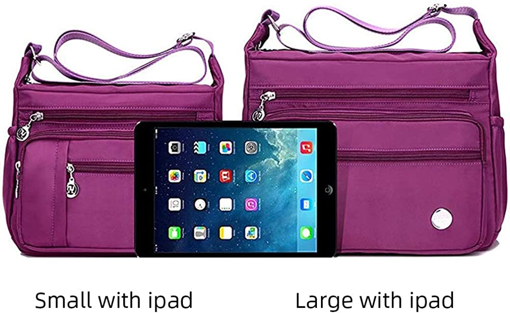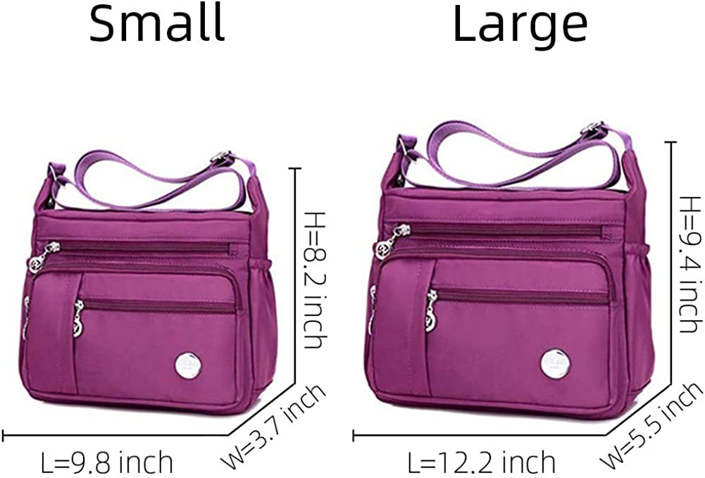Waterproof Nylon,Polyester,Nylon   Polyester lining  Zipper closure  Machine Wash  Material: Made of Polyester lining lightweight waterproof nylon with classic zippers,smooth and easy to open and close,this nylon material purse is easy to care for wipe clean or machine wash.  Exterior Dimensions: Small:9.8x 3.7x 8.2 inch (L x W x H).Large:12.2x 5.5 x 9.4 inch(L x W x H).Both sizes come with an adjustable strap.Two sizes of bags meet your different needs.  Mulit-Pockets: Exterior: 2 side pockets,3 front zipped pockets,1 back zipper pocket;Interior:2 zipper pockets and two open pocket.Large Capacity,This purse contains interior and exterior pockets, easy to collect your phone, wallet, keys, books, umbrella, glasses case and so on.  Multi-Functional: Fashionable style,this bag can be used as a handbag,shoulder bag or crossbody bag with a variety of storage options and organization features, ideal for travel, errands, shopping, and diaper bag for parents on the go. Comfortable for your daily wear: Lightweight nylon means less stress on sensitive shoulder muscles.Even after a full day of sightseeing,shopping,or errands this casual yet stylish tote won’t tug. Show more