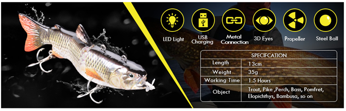 • ?【Bass Lure】Robotic Swimming Lure's body has a multi-section design, and the flexible, flexible body forms a more realistic form of fish swimming. The different sections of the Lure body are connected by metal and can withstand the strong bite force, unlike the ordinary Lure which is easily connected by the big fish.