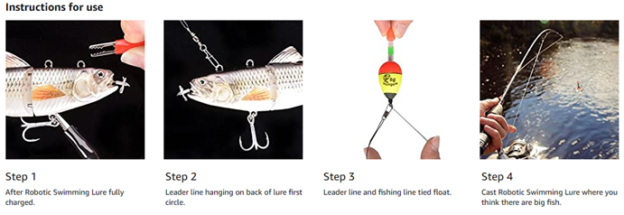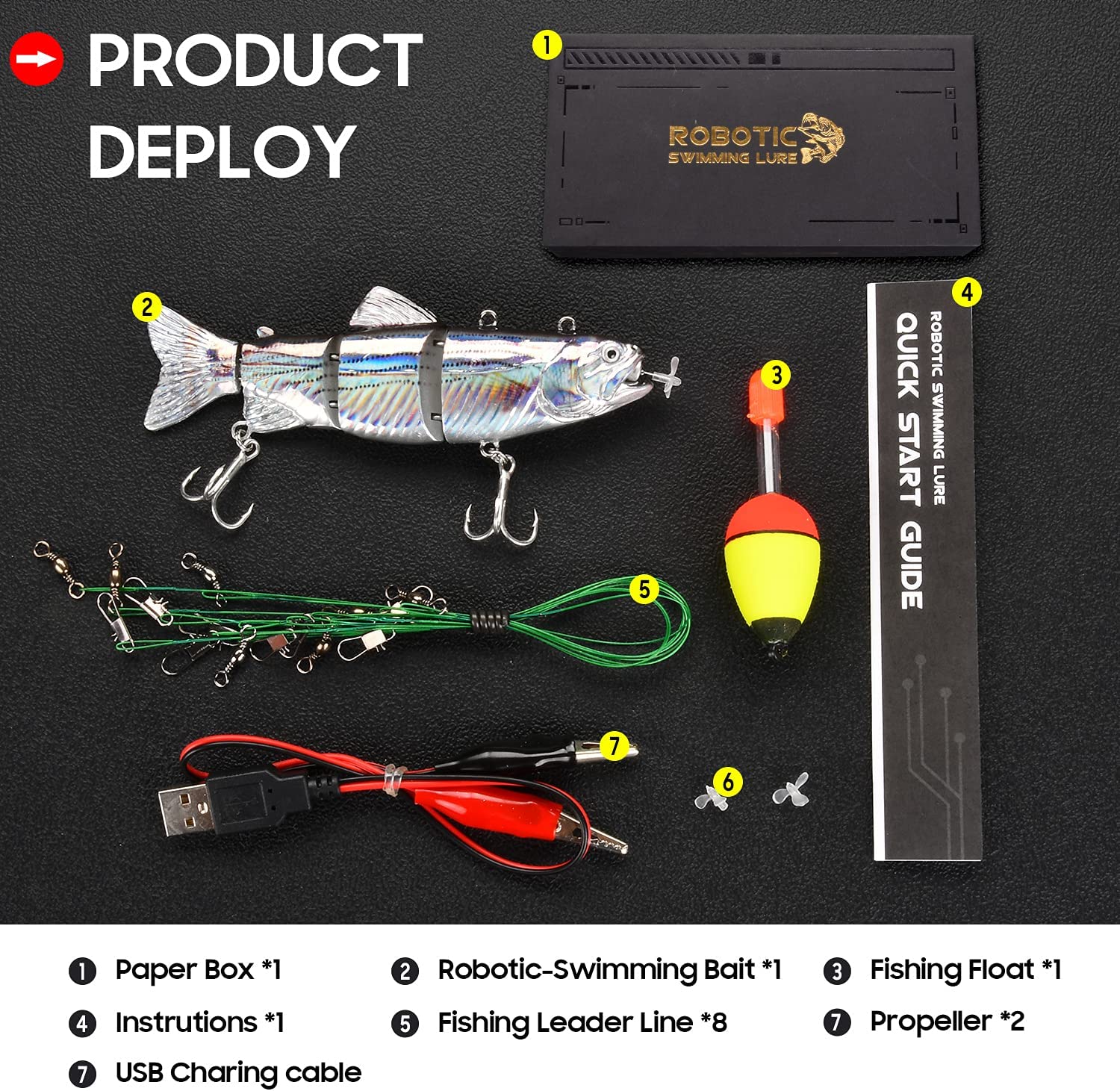 • ?【Fishing lure】Packing List:1x Robotic Swimming Lures ,1x USB Cable,1x Float,2x Spare propeller,8x Leader Line(15/20/25/30 cm),1x box.
