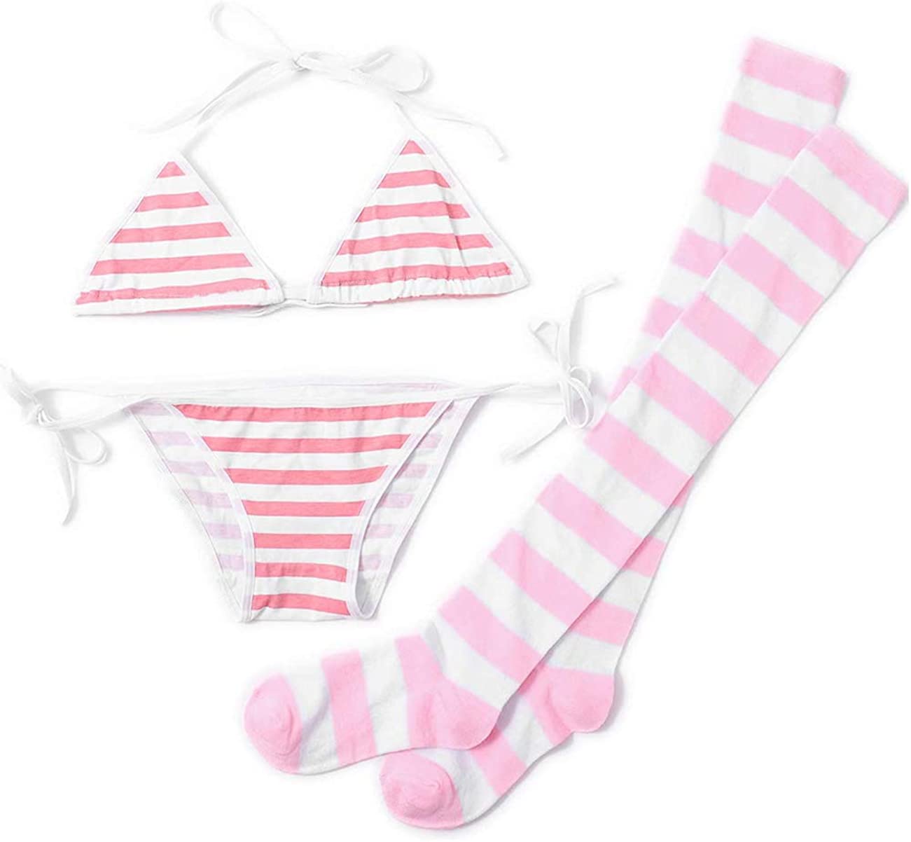 3 PCS Sexy Japanese Cute Anime Lingerie Set for Women with Striped Thigh High Socks BikiniFabric: PolyesterClassic stripes tiny bikini, anime cosplay inspired designSize: One size fits XS, S, M, reference weight(77-112lb/35-55kg ), for skinny girls and womenPerfect for loungewear, spa, vacation, pool, everyday wearNeck: V-NeckSleeves: SleevelessWaist: low waistPattern: Striped PrintedSeason: Summer,Spring,Autumn,WinterPackage included:1x anime bikini sets and 1x a pair of thigh high stockingAttention:Please wash loungewear before you wear it for the first time.