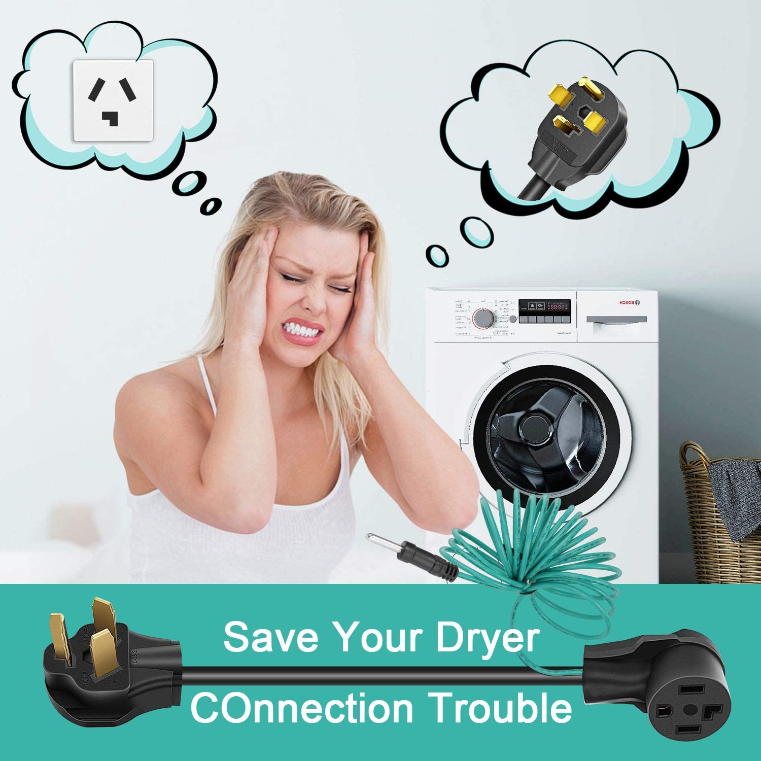 - Dryer Adapter Cord: Connect the 3 prong Nema 10-30P male plug to the female wall outlet of Nema 10-30R, and plug your dryer 4 prong Nema 14-30P plug to the female cable socket (Nema 14-30R).