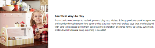 From classic wooden toys to crafts, pretend play, and games, Melissa & Doug products provide a launch pad to ignite imagination and a sense of wonder in all children so they can discover themselves, their passions, and their purpose.Since the company’s founding more than 25 years ago, Melissa & Doug has consistently delivered innovative products that inspire open-ended thinking, encourage kids to see new possibilities, and offer Countless Ways to Play. It’s part of a bigger vision to Take Back Childhood. Because by giving children a true childhood with the space and freedom to explore their world, we give them a path to realizing their full potential!
