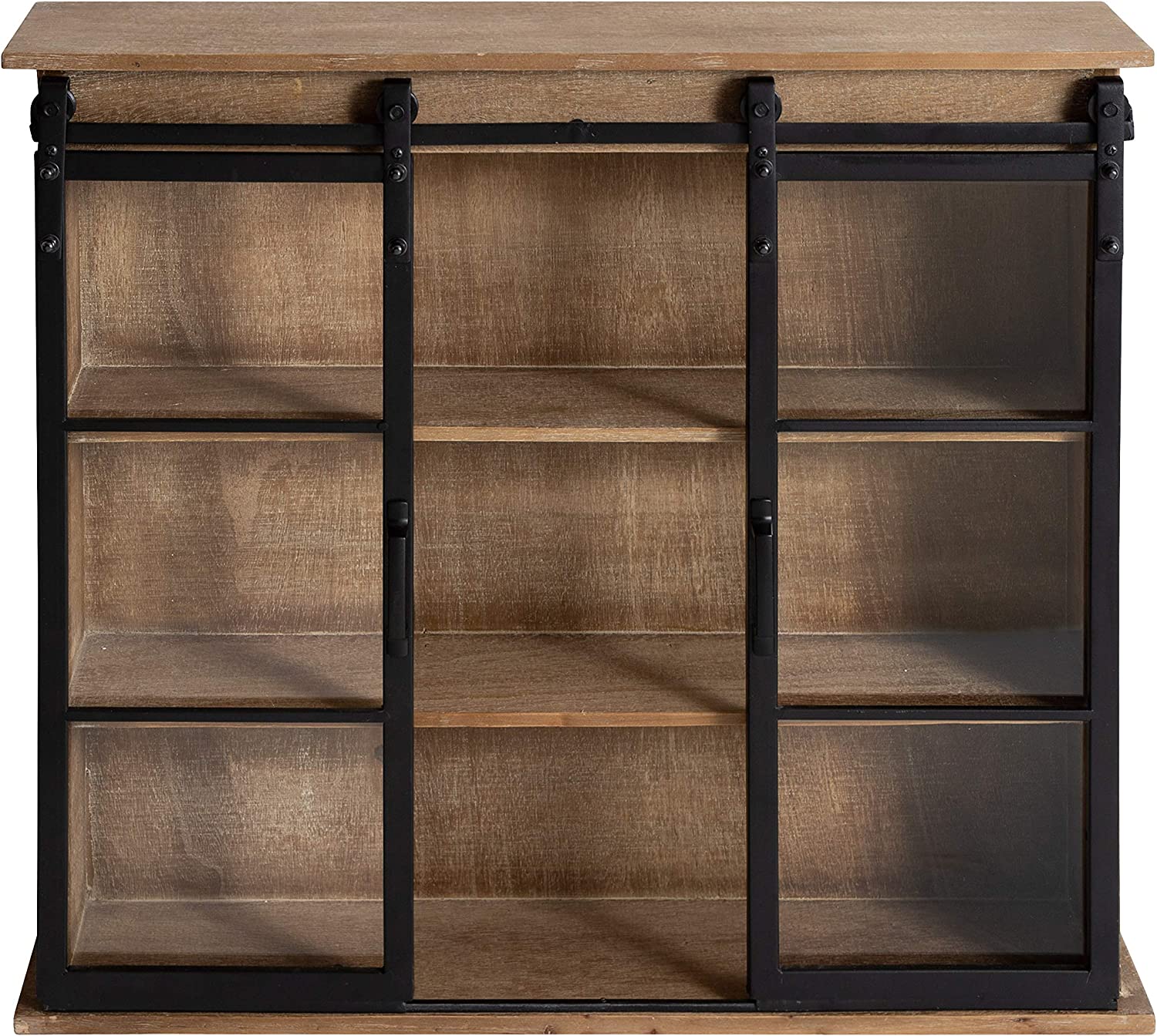 MODERN FARMHOUSE DESIGN: This wall hanging cabinet features a hand-distressed wooden finish and two beautiful metal framed sliding glass doors for the ultimate modern farmhouse accent