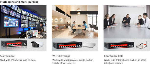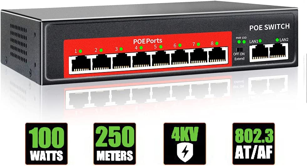 【8 port poe switch*100M@120W 】PoE switch with 8 port PoE + 2 Uplink port,8× PoE ports providing up to 30W per port, total PoE budget 120W,2 port uplink ideal for connecting NVR and Internet, etc.