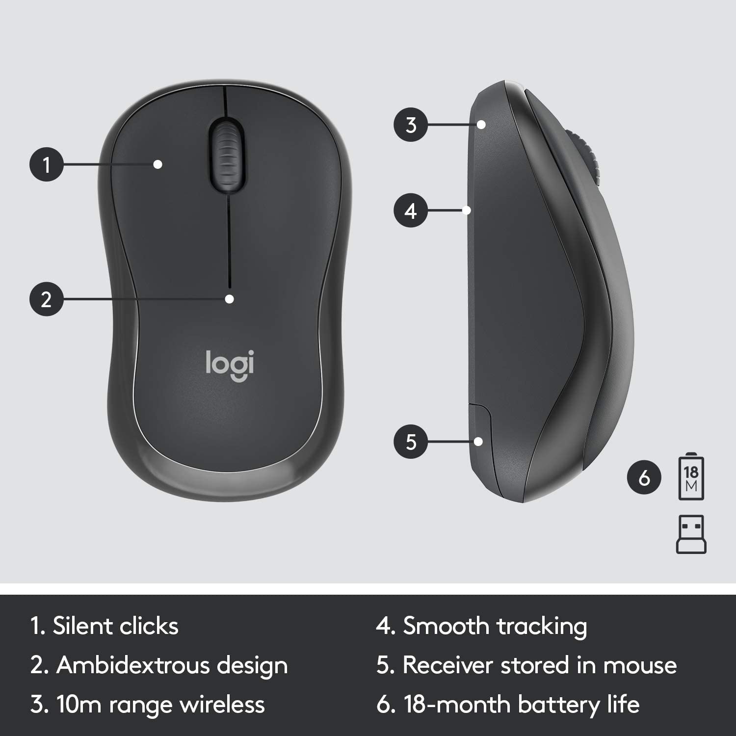 Strong reliable 2. 4 GHz wireless connection with 10m range and a tiny USB receiver for a clean, clutter free desk area