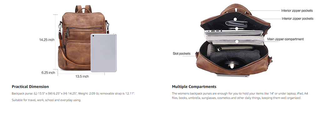 Multiple Compartments:1 main compartment with 2 inner zipper pockets, 2 inner slot pocket, 2 front zipper pockets, 2 side pockets and 1 back zipper pocket. Different sizes pockets are enough for you to hold your items like 14" or under laptop, iPad, A4 files, books, umbrella, sunglasses, cosmetics and other daily things, keeping them well organized.