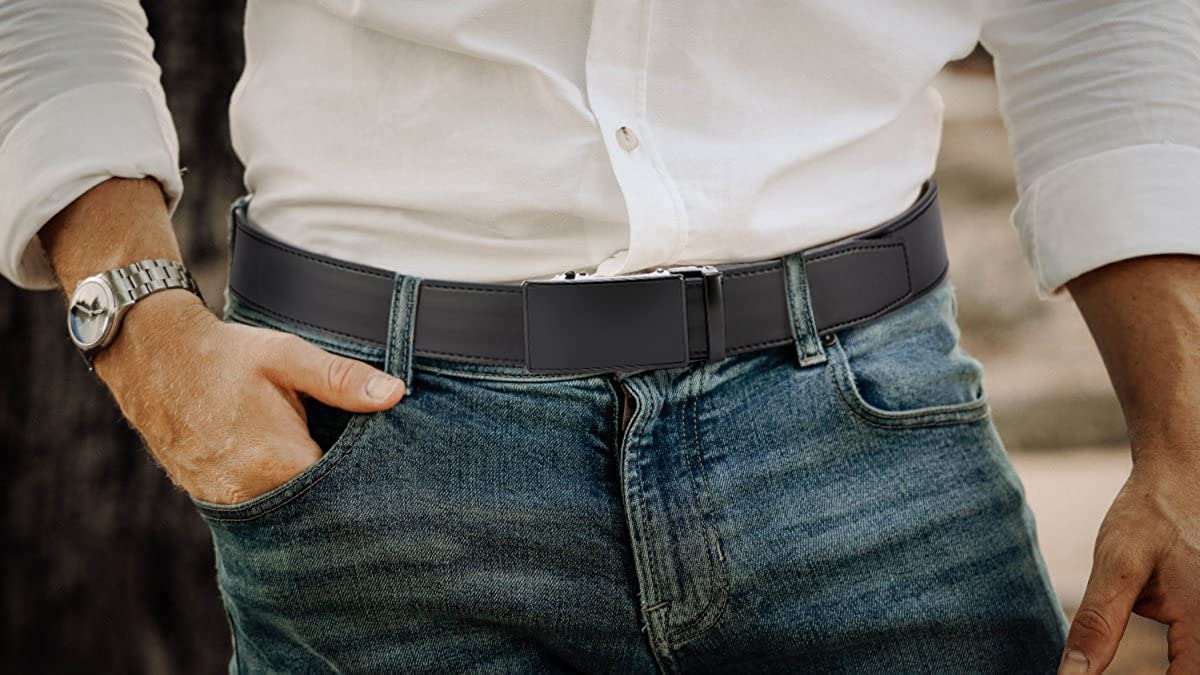 - EASY TO USE - Slide the leather belts for men into the buckle, and click on the buckle to lock it automatically. Gently push the lever on the side of the automatic buckle, and pull the casual belt to release. Simple, smooth, and sleek!