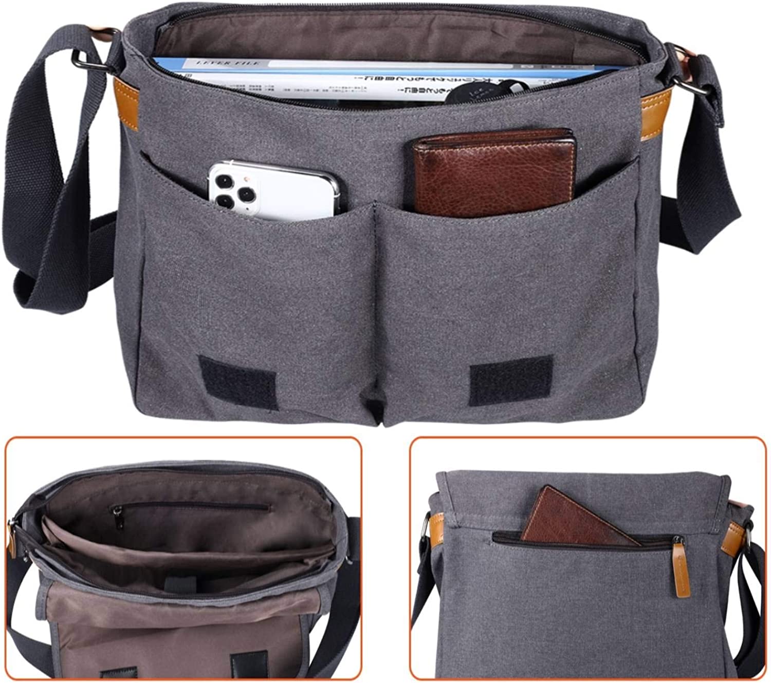 【Multiple Rooms Messenger Bag】: A total of 8 pockets. Roomy enough for all of your stuffs: 2 front zipper pocket, 2 front button pocket, 2 open inner Pockets, 1 inner zipper pocket and 1 back zipper pocket.